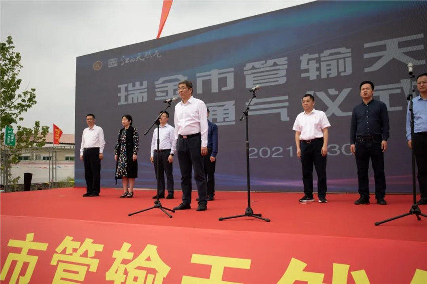 投产通气仪式上,瑞金市委常委、常务副市长刘晓龙代表市委市政府对瑞金分输站的投产通气表示祝贺。他指出,瑞金市天然气管输通气是贯彻落实省委省政府提出的2021年“县县通气”决策部署的崭新成果,也是各级各部门支持原中央苏区振兴发展的重要体现,将极大改善瑞金市的发展环境,进一步优化能源结构,增强城市功能,改善居民生活质量,为推动瑞金市实现高质量跨越式发展提供强劲动力。接下来,瑞金市将积极抓住这一机遇,加快相关配套设施建设,加大使用力度,让更多居民、更多企业用上清洁、安全、经济的管输天然气。